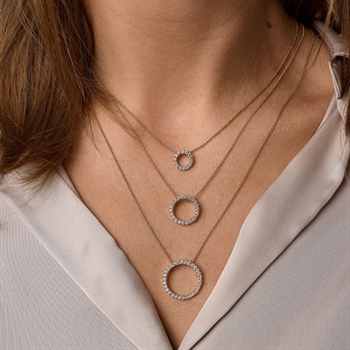Cirkel vedhænget kommer i flere størrelser og i rødguld, hvidguld og rosaguld (for rosaguld kontakt vores kundeservice)