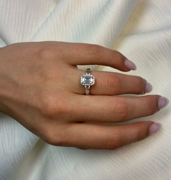 14 kt hvidguld Halo Luxury by Siersbøl med 14 karat hvidgulds diamant ring med ialt 1,45 ct lab grown diamanter TW/VS - 1 ct kvadratisk center sten med ialt 0,45 ct diamanter rundt om center stenen og på ringskinne.