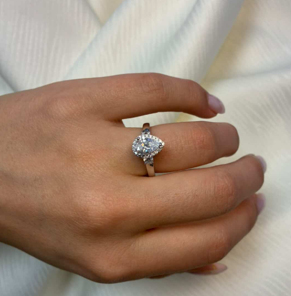 14 kt hvidguld Halo Luxury by Siersbøl med 14 karat hvidgulds diamant ring med ialt 1,45 ct lab grown diamanter TW/VS - 1 ct dråbe formet center sten med ialt 0,45 ct diamanter rundt om center stenen og på ringskinne.