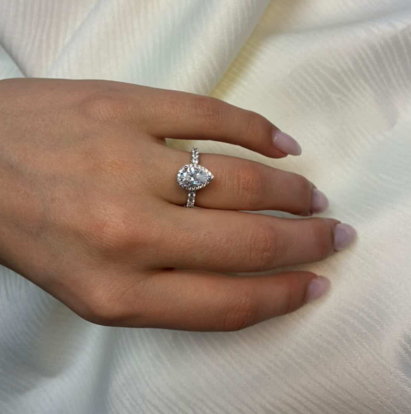 14 kt hvidguld Halo Luxury by Siersbøl med 14 karat hvidgulds diamant ring med ialt 1,52 ct lab grown diamanter TW/VS - 1 ct dråbe formet center sten med ialt 0,52 ct diamanter rundt om center stenen og på ringskinne.