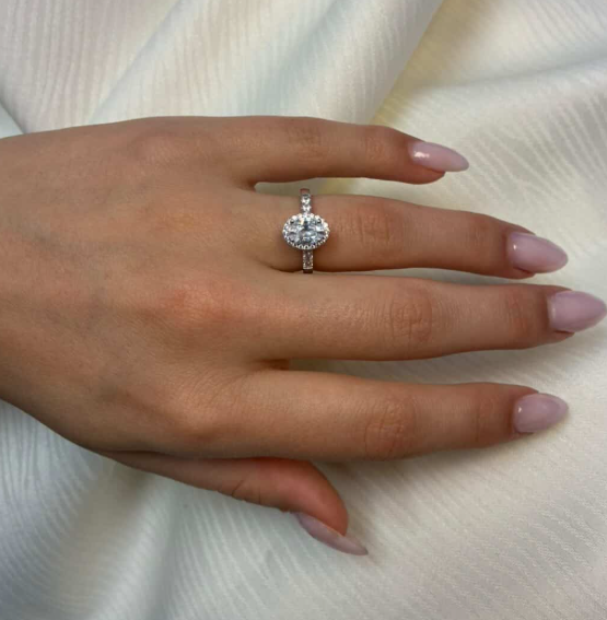 14 kt hvidguld Halo Luxury by Siersbøl med 14 karat hvidgulds diamant ring med ialt 1,32 ct lab grown diamanter TW/VS - 1 ct oval center sten med ialt 0,32 ct diamanter rundt om center stenen og på ringskinne.