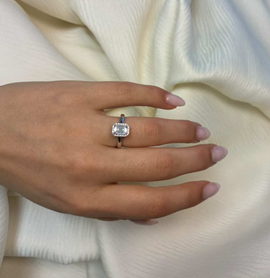14 kt hvidguld Halo Luxury by Siersbøl med 14 karat hvidgulds diamant ring med ialt 1,12 ct lab grown diamanter TW/VS - 1 ct kvadratisk center sten med ialt 0,12 ct diamanter rundt om center stenen og på ringskinne.
