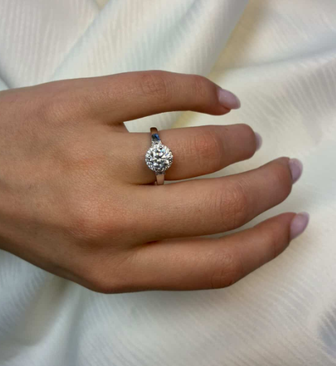 14 kt rødguld Halo Luxury by Siersbøl med 14 karat diamant ring med ialt 1,45 ct lab grown diamanter TW/VS - 1 ct rund center sten med ialt 0,45 ct diamanter rundt om center stenen og på ringskinne.