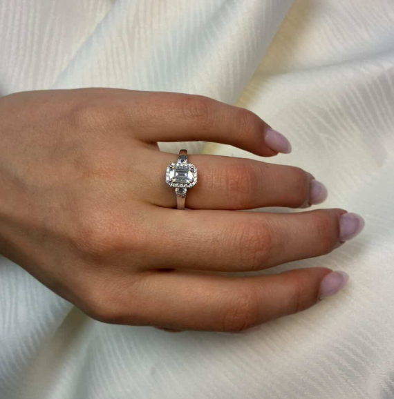 14 kt rødguld Halo Luxury by Siersbøl med 14 karat diamant ring med ialt 1,45 ct lab grown diamanter TW/VS - 1 ct kvadratisk center sten med ialt 0,45 ct diamanter rundt om center stenen og på ringskinne.