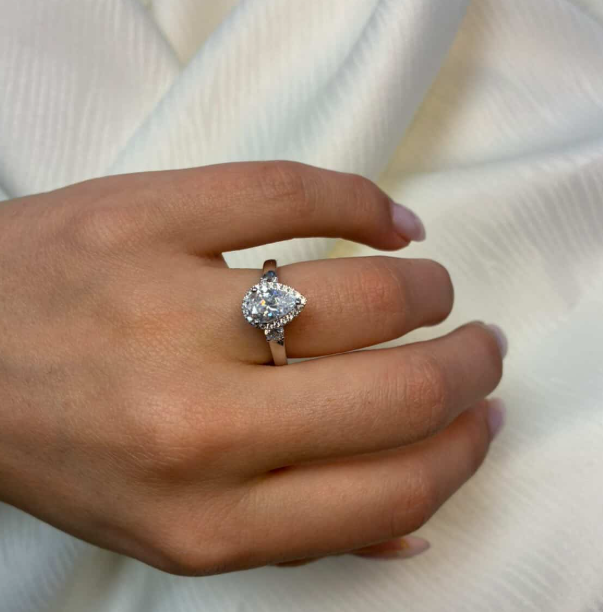 14 kt rødguld Halo Luxury by Siersbøl med 14 karat diamant ring med ialt 1,45 ct lab grown diamanter TW/VS - 1 ct dråbe formet center sten med ialt 0,45 ct diamanter rundt om center stenen og på ringskinne.