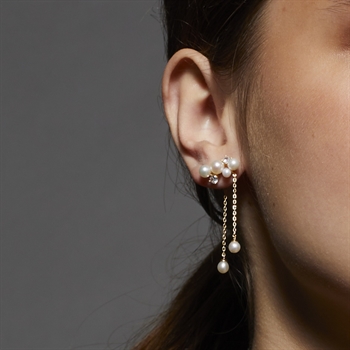 Delikat og elegant ørestik fra Alura Copenhagens Eclipse-kollektion, inspireret af mystiske sol- og måneformørkelser og kombinationen af perler og glitrende detaljer. Smykket er lavet af 925 sterlingsølv med 18 karat guldbelægning, ferskvandsperler (ca. 2-4 mm) og facetslebne zirkonia (ca. 2 mm), hvilket skaber et sofistikeret, feminint look. Den fine kæde fås i to længder (ca. 25 mm og 35 mm), så ørestikken kan bæres enten enkeltvis eller som en del af din ørestak.