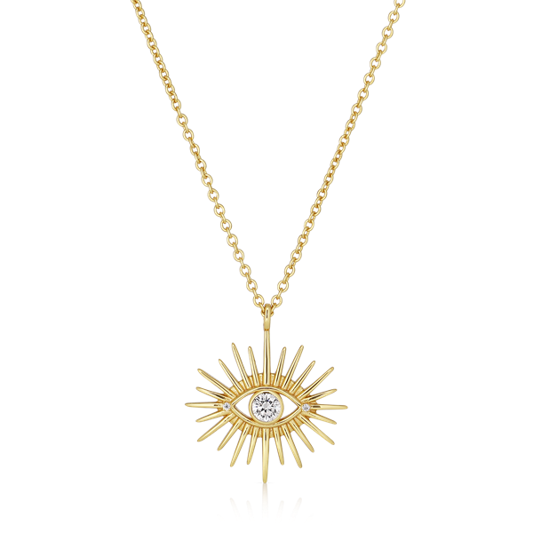 Elegant og iøjnefaldende halskæde fra Alura Copenhagens Eclipse-kollektion, inspireret af de fascinerende sol- og måneformørkelser med et skandinavisk, moderne touch. Smykket er fremstillet i 925 sterlingsølv med 18 karat guldbelægning og prydet med en funklende facetsleben zirkonia-detalje i et “øje”-vedhæng, som giver et tidløst og sofistikeret look. Kæden er ca. 44 cm lang med en ekstra 5 cm forlængelse, så længden kan justeres efter ønske – perfekt til både hverdag og festlige lejligheder.