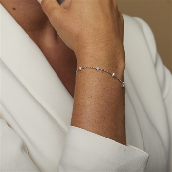 Elegant og tidløst armbånd fra Alura Copenhagens Venus-kollektion, inspireret af planeten Venus – det næstklareste objekt på nattehimlen efter månen og et symbol på kærlighed og skønhed i romersk mytologi. Det er lavet i 925 sterlingsølv og prydet med funklende facetslebne zirkoniaer samt smukke ferskvandsperler, som giver et sofistikeret og feminint udtryk. Armbåndet har en længde på ca. 16 cm med yderligere ca. 2 cm forlængelse, så det kan tilpasses præcist efter ønske – perfekt til både hverdag og fest.