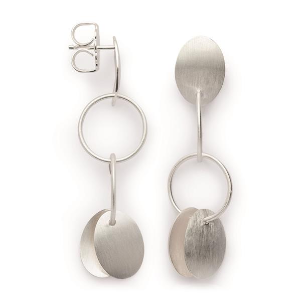 Et par ørestikker med et kunstnerisk udtryk, der fanger blikket gennem sammenkoblede cirkulære og ovale former. Designet skaber en dynamisk bevægelse, der gør disse ørestikker til mere end bare et simpelt smykke – de er en subtil samtalestarter. Fremstillet af 925/- sterling sølv, som er anerkendt for sin styrke og holdbarhed, så du kan bære dem dag efter dag uden bekymring. Sterling sølv er desuden allergivenligt, hvilket gør dem velegnede, hvis du har følsom hud. Den matte finish giver ørestikkerne et moderne og sofistikeret udtryk, der skiller sig ud fra traditionelle polerede overflader. Denne overflade reflekterer lyset på en blødere måde og skaber en elegant kontrast til de geometriske former. Designet balancerer mellem det kunstneriske og det bærbare, så du får et smykke, der både udtrykker individualitet og passer til mange forskellige outfits.