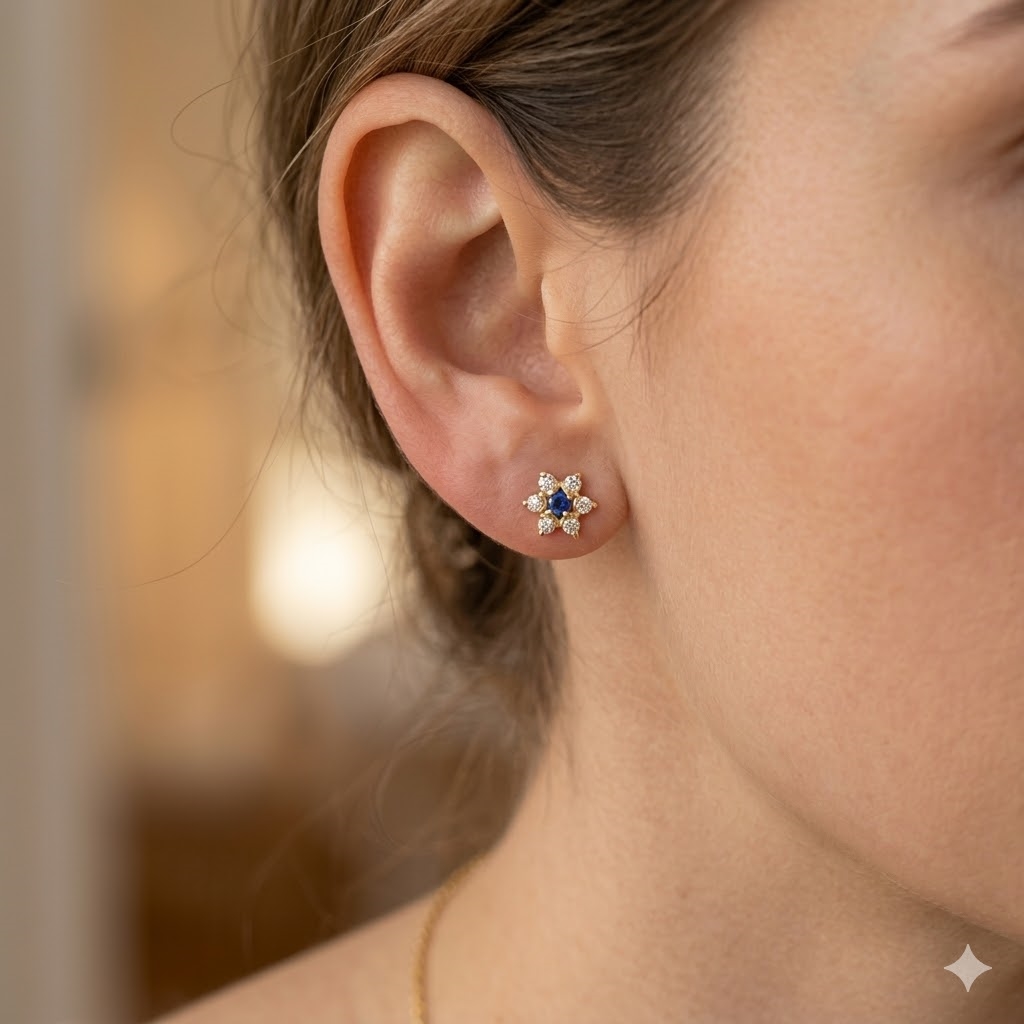 8 karat guld safir / zirkonia fra Støvring Design med 8 karat stjerne ørestikker med blå safir i center og 6 hvide zirkonia i takkerne