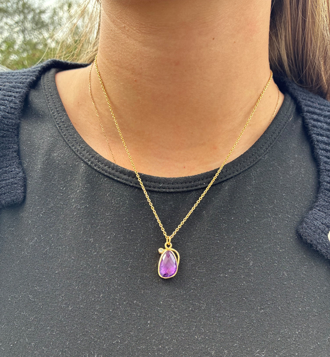 Smukt vedhæng i forgyldt sterling sølv med 14 x 9 mm facetteret amethyst og 2 mm hvid Topas.