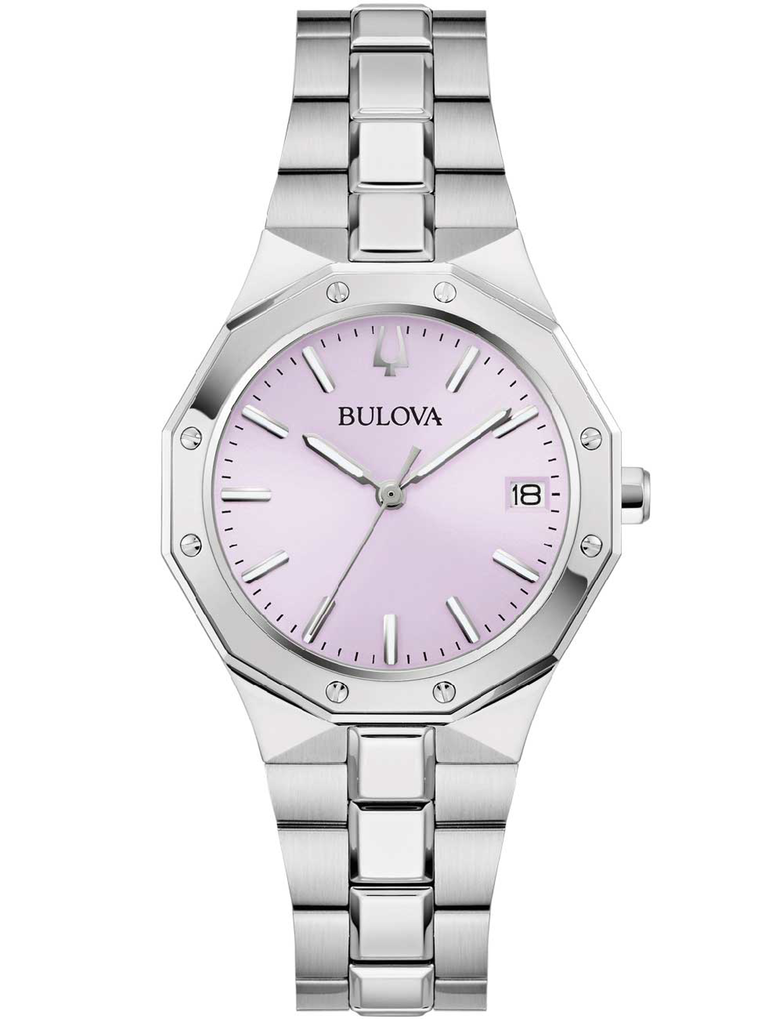 Dette Bulova-ur kombinerer klassisk stil med moderne detaljer i et 32 mm kabinet. Det metalliske armbånd med leddelt design sikrer god komfort ved daglig brug, mens den lyse lilla urskive tilfører et særpræget touch.