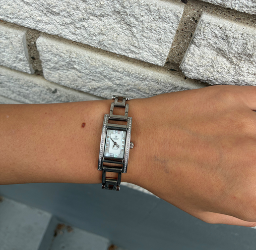 Uret er et kvadratisk stål dameur med en smykke lignende lænke.   Uret måler 18 x 34 mm og har en perlemors hvid urskive med 8 stk Top Wesselton diamanter fattet og 56 stk diamanter på urkassen