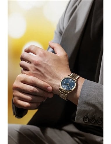 Det blå skivedesign i guilloché-stil giver dybde og karakter, mens roséguldsdetaljerne tilfører varme og elegance. Armbåndet ligger tæt og komfortabelt om håndleddet, og låsen er diskret men sikker. Med dette ur får du ikke blot et smykke, men en præstation.