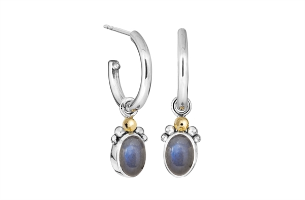 Creol - Golden Shadow forener sterlingsølv og 14 kt. guld i et sofistikeret design, der tilføjer et strejf af elegance til en professionel garderobe. Den klassiske creol-form er diskret nok til formelle kontormiljøer, mens labradoritstenen med sit subtile farvespil komplimenterer forskellige outfits uden at være prangende.