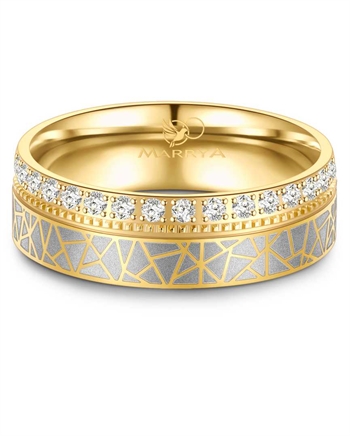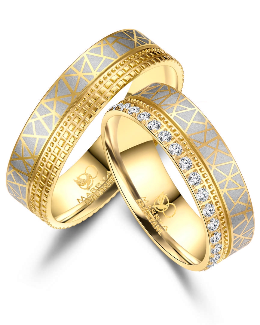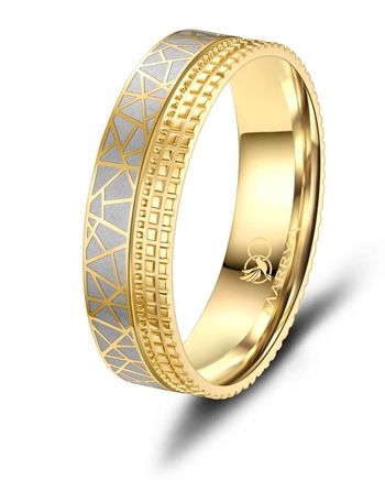 Marrya fra Houmann, Et par 6 mm rustfri vielsesringe, med et blankt forgyldt mønster i den mattereret overflade