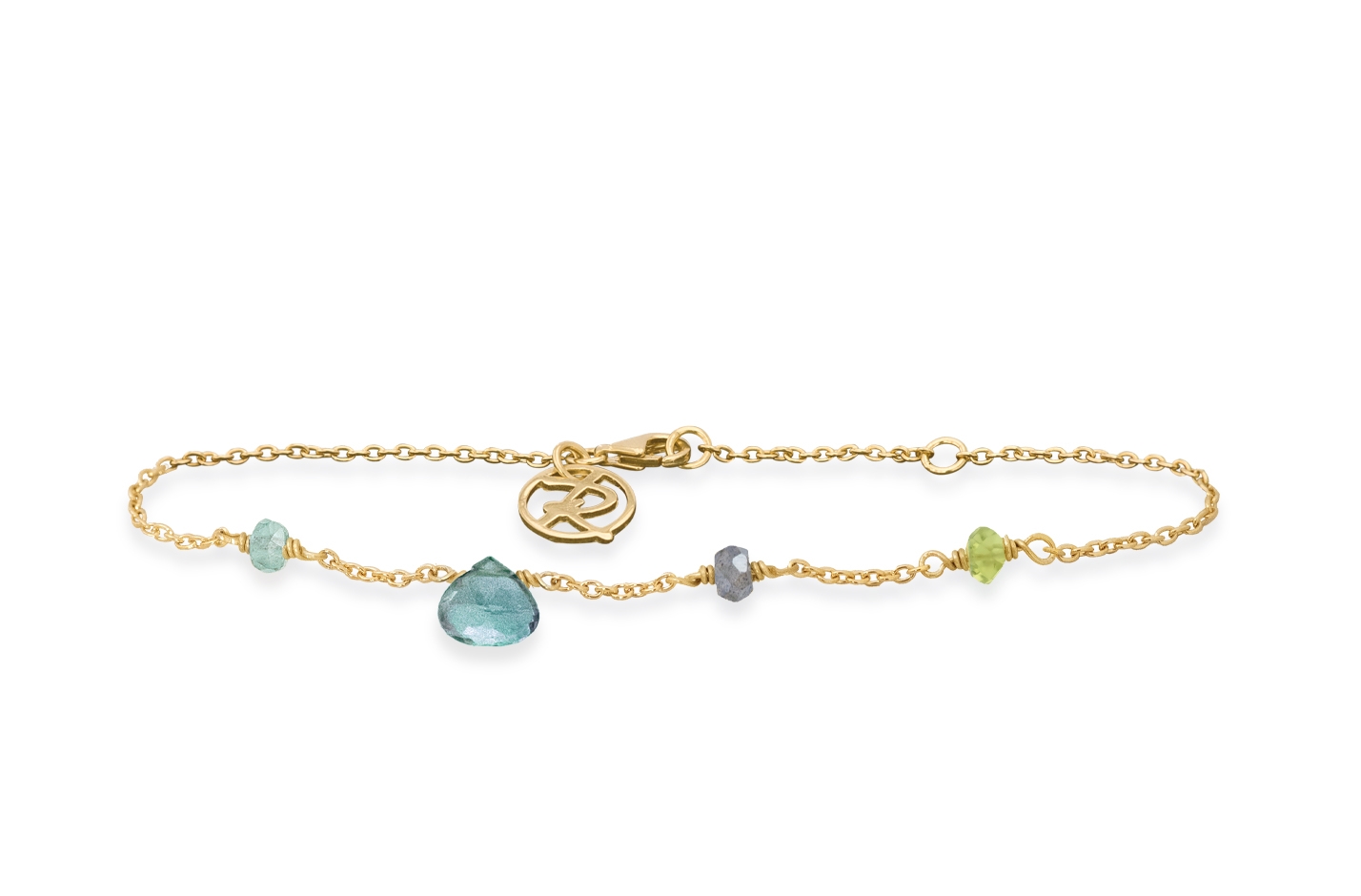 Dette forgyldte armbånd fra Rabinovich er en skøn symfoni af grønne nuancer, hvor grøn kvarts, turmalin, fluorit og peridot skaber et fascinerende farvespil. Den gyldne kæde med små led fremhæver de indlagte ædelsten, som giver armbåndet et sofistikeret og naturinspireret udtryk.