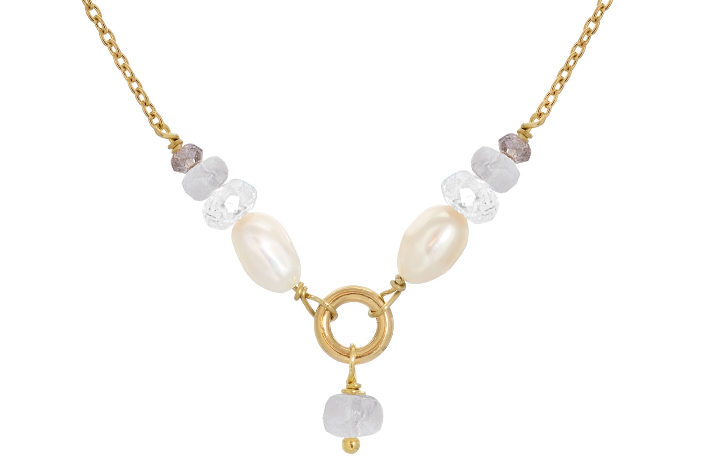 Dette sofistikerede Cordelia-collier kombinerer hvide ferskvandsperler med peridot, apatit og aquamarin i en harmonisk farvesymfoni. Den centrale guldfarvede ring med det blå vedhæng skaber et unikt fokuspunkt, der særligt skiller sig ud ved festlige lejligheder. Det forgyldte sterlingsølv giver smykket et luksuriøst udtryk.