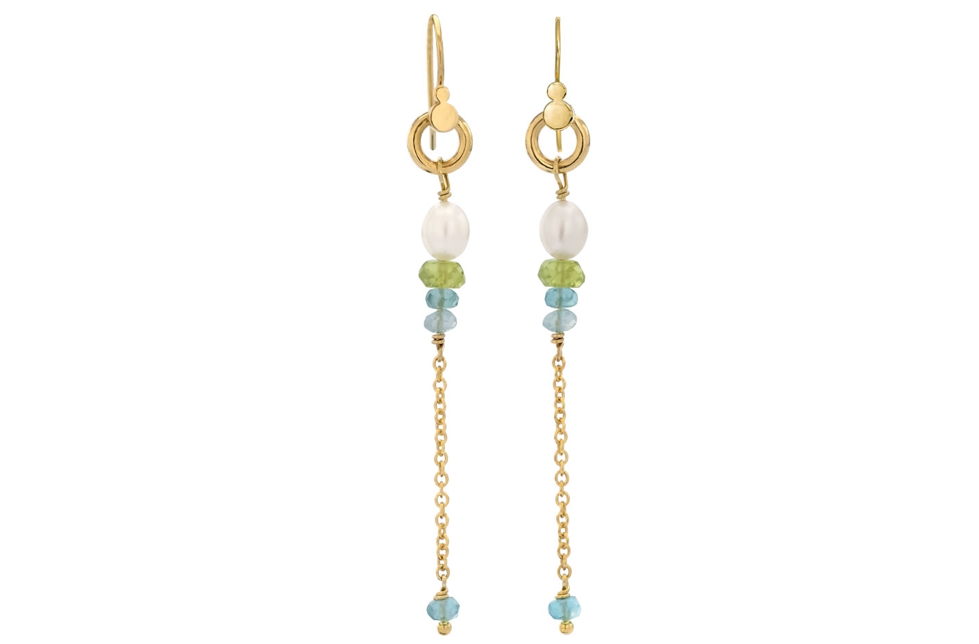 Disse sofistikerede ørehængere kombinerer hvide ferskvandsperler med peridot, apatit og aquamarin i et harmonisk farvespil. Den unikke sammensætning af ædelsten skaber et maritimt udtryk, der komplementerer festlige outfits og tilfører en raffineret elegance til enhver anledning.