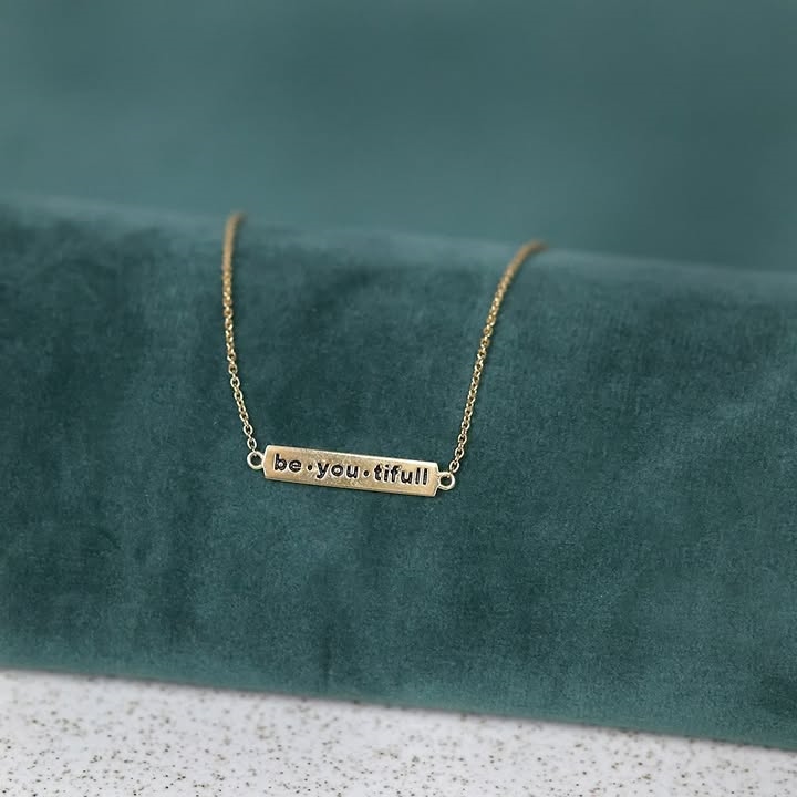 forgyldt sølv fra Story by Kranz & Ziegler med Halskæde med lille aflang plade. Forsiden prydes med et mønster af firkanter mens bagsiden er graveret med "Be-you-tifull"