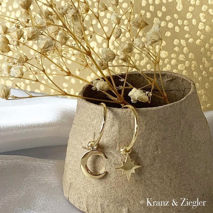 Forgyldte sølvøreringe med blank overflade og månevedhæng fra Story by Kranz & Ziegler