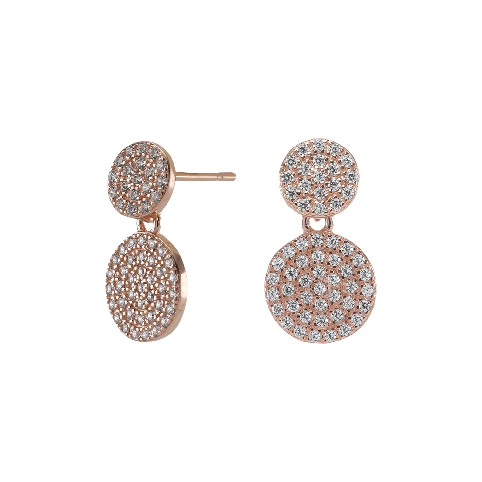 Spektakulære øreringe, som oser af elegance – perfekte til formelle begivenheder, hvor smykkerne gerne må være ekstraordinære. Vores Annie øreringe, i rosaforgyldt sølv, er i sandhed en fryd for øjet. Øreringenes to runde flader er besat med funklende,