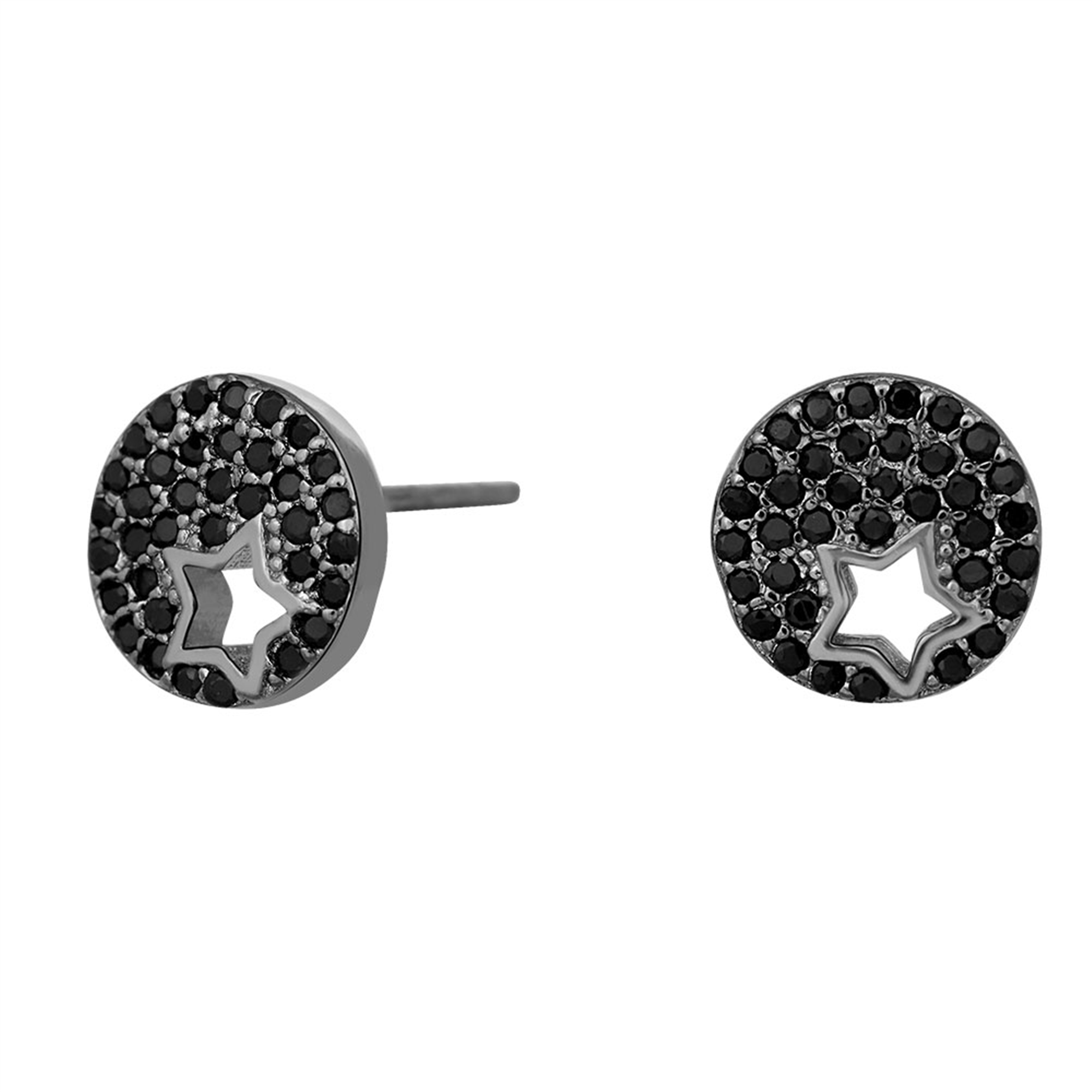 Søde og glimtende stjerne ørestikker. De sort rhodinerede sølvørestikker fra vores CalaNor serie er en charmerende tilføjelse til et hvert outfit. Smykket består af en rund plade besat med kubisk zirkonia, hvor der nederst i cirklen er udskåret