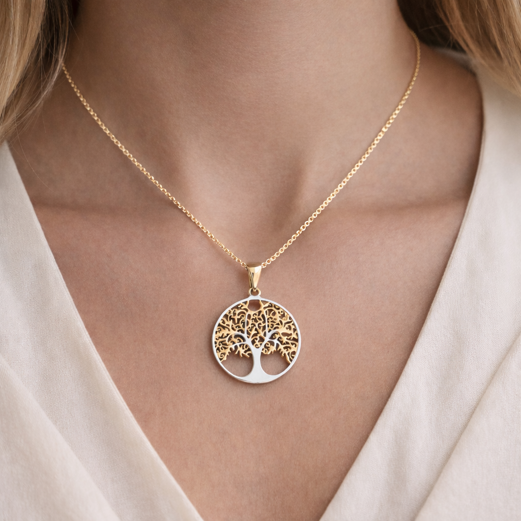 Livets træ vedhæng i tofarvet sølv, Ø24 mm og med 45 cm forgyldt kæde