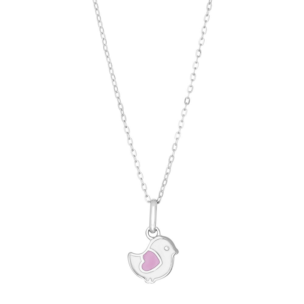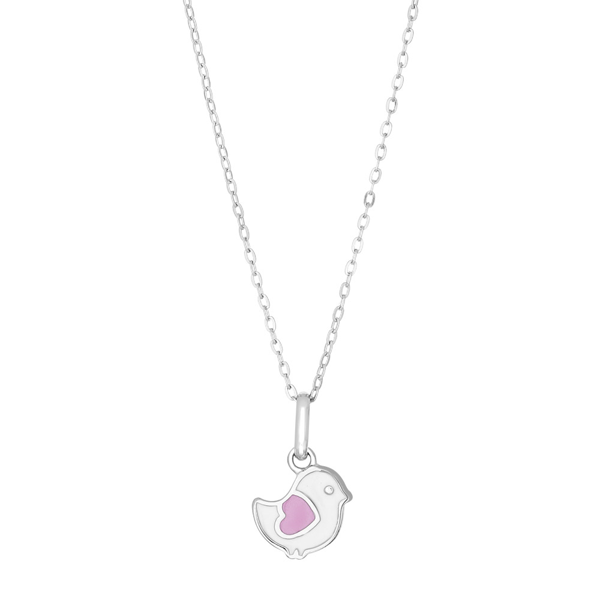 Et charmerende fuglevedhæng i sølv, der fanger barnets fantasi med sin legende form og søde detaljer. Fuglen er udført i rhodineret sølv med en blank overflade, der giver smykket en flot glans og beskytter metallet mod at løbe an. På fuglens krop sidder et lille pink hjerte, der tilføjer et personligt og kærligt præg til designet. Vedhænget måler 8,5 x 9 mm, hvilket gør det til en passende størrelse for børn - hverken for stort eller for småt. Kæden følger med og består af små, runde led, der sikrer en behagelig pasform om halsen. Materialet er ægte sølv, så du får et kvalitetssmykke, der holder over tid. Den blanke finish fremhæver fuglens konturer og gør det nemt at holde smykket pænt med en blød klud.