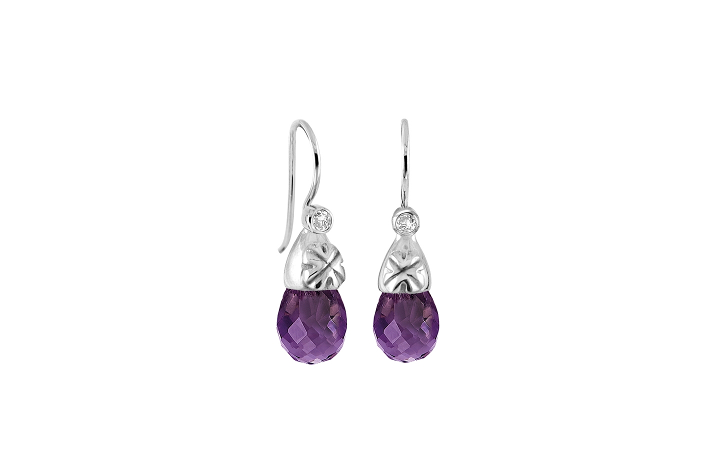 Disse ørehængere forener tidløst dansk design med håndværksmæssig præcision. Den facetterede, lilla dråbeform tilføjer et farverigt og elegant touch til festtøj, mens sterlingsølvets kvalitet sikrer, at de ser sofistikerede ud ved bryllupper og gallamiddage. Det dekorative element og den sikre krog garanterer komfortabel brug.