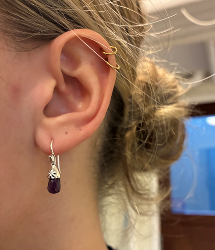 Disse ørehængere forener tidløst dansk design med håndværksmæssig præcision. Den facetterede, lilla dråbeform tilføjer et farverigt og elegant touch til festtøj, mens sterlingsølvets kvalitet sikrer, at de ser sofistikerede ud ved bryllupper og gallamiddage. Det dekorative element og den sikre krog garanterer komfortabel brug.