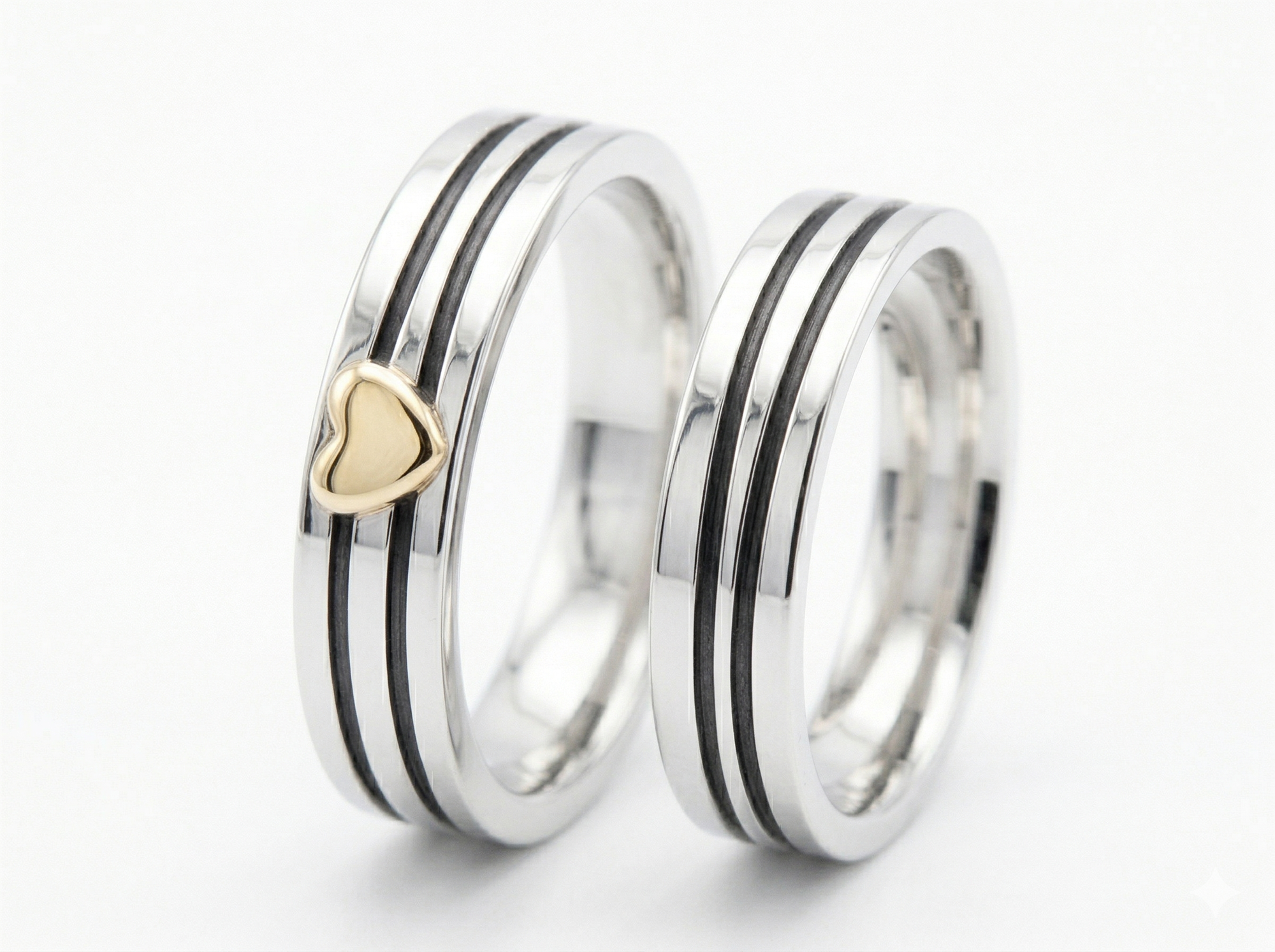 Smukt ringpar fra Randers Sølv i massivt sterling sølv. Ringene er designet med skrå riller, som giver et elegant og moderne udtryk. Dameringen er udsmykket med et diskret hjerte, der tilfører et romantisk præg.