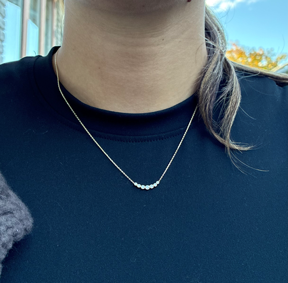 Den tynde kæde og det buede design gør halskæden let at style med din eksisterende smykkesamling. Zirkoniastenes placering skaber en diskret glans, der komplimenterer enhver påklædning uden at overdøve din personlige stil.