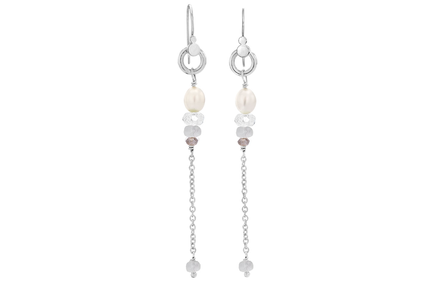 Fra det anerkendte mærke Rabinovich kommer disse eksklusive ørehængere i sterlingsølv, der forener kunstnerisk design med holdbar kvalitet. De lange kæder prydes af hvide ferskvandsperler, bjergkrystal, regnbue månesten og labradorit, der tilsammen skaber et sofistikeret udtryk ideel til både kulturelle arrangementer og hverdagens særlige øjeblikke.