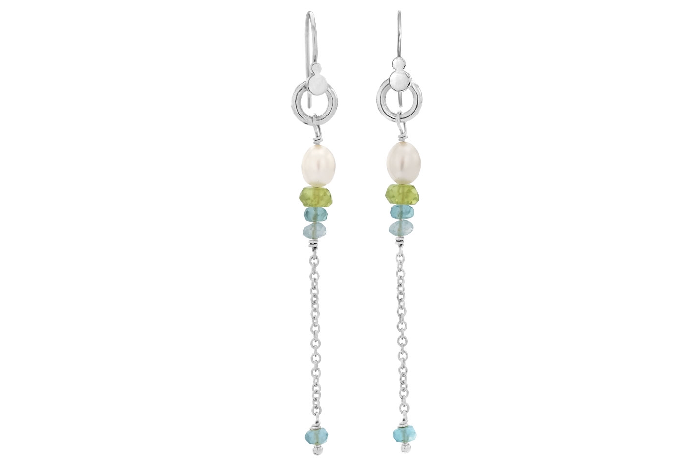 Disse raffinerede Cordelia ørehængere kombinerer hvide ferskvandsperler med en særlig sammensætning af peridot, apatit og aquamarin. Det elegante design tilføjer et sofistikeret touch, der passer glimrende til kulturelle begivenheder som kunstudstillinger eller teaterforestillinger, hvor den harmoniske farvekombination komplementerer både farverige og neutrale outfits.