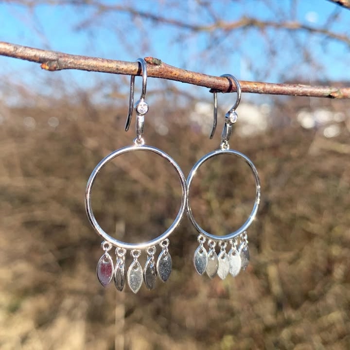 sterling sølv fra Story by Kranz & Ziegler med Flotte ørehængere med 5 små "Dancing Leafs". Cirklerne måler Ø 22 mm og har en fin lille zirkonia øverst.