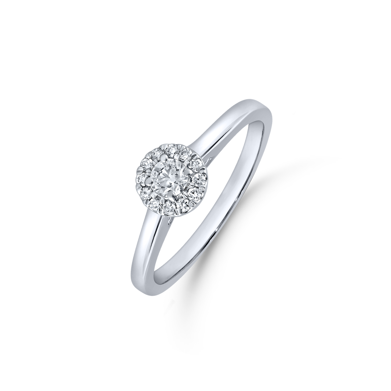 14 kt. hvidguld ring cirkel med 1 stor og 12 små brillanter omkring.