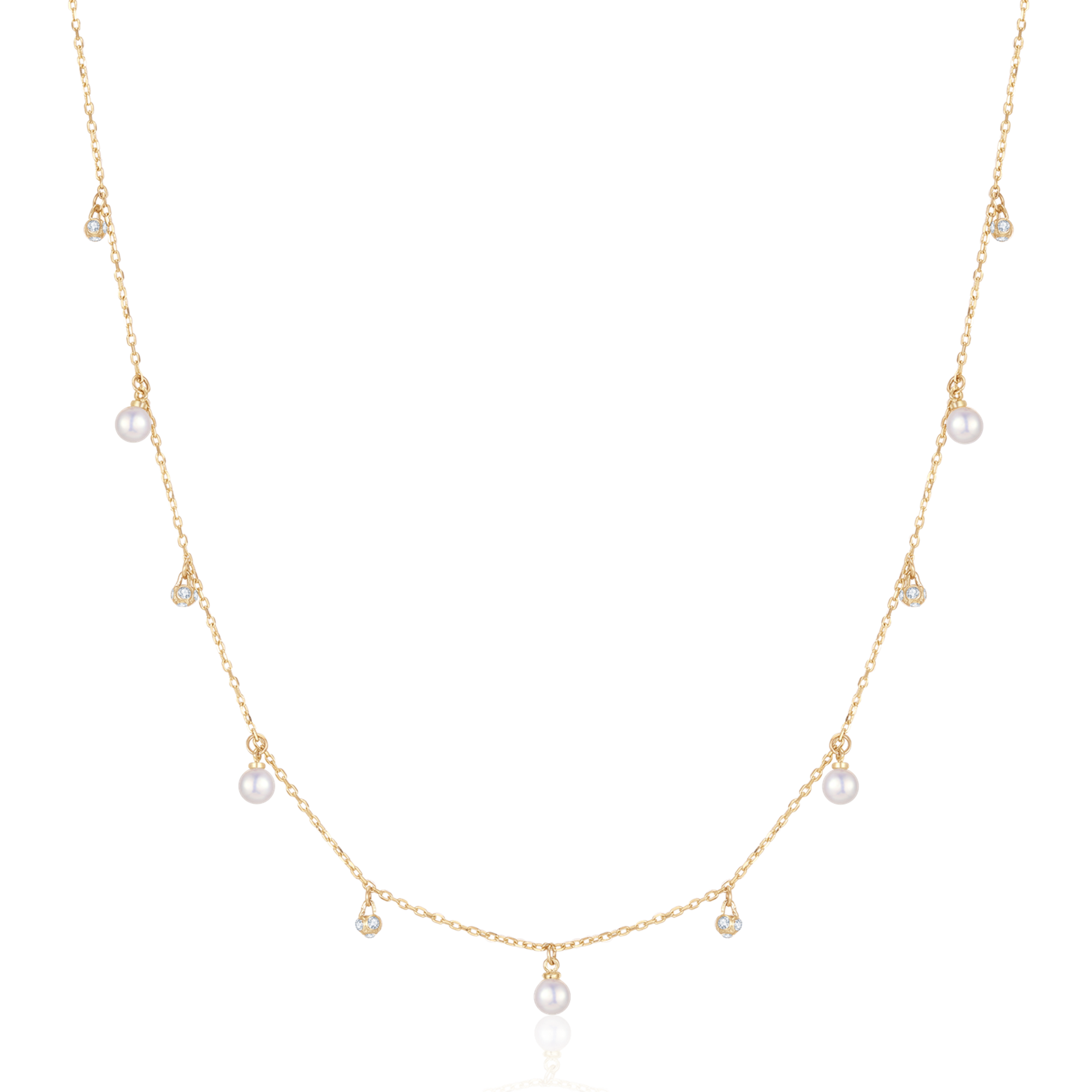 8 kt. guld collier kæde med ferskvandsperler skiftevis med kugle i bunden af kæde.
