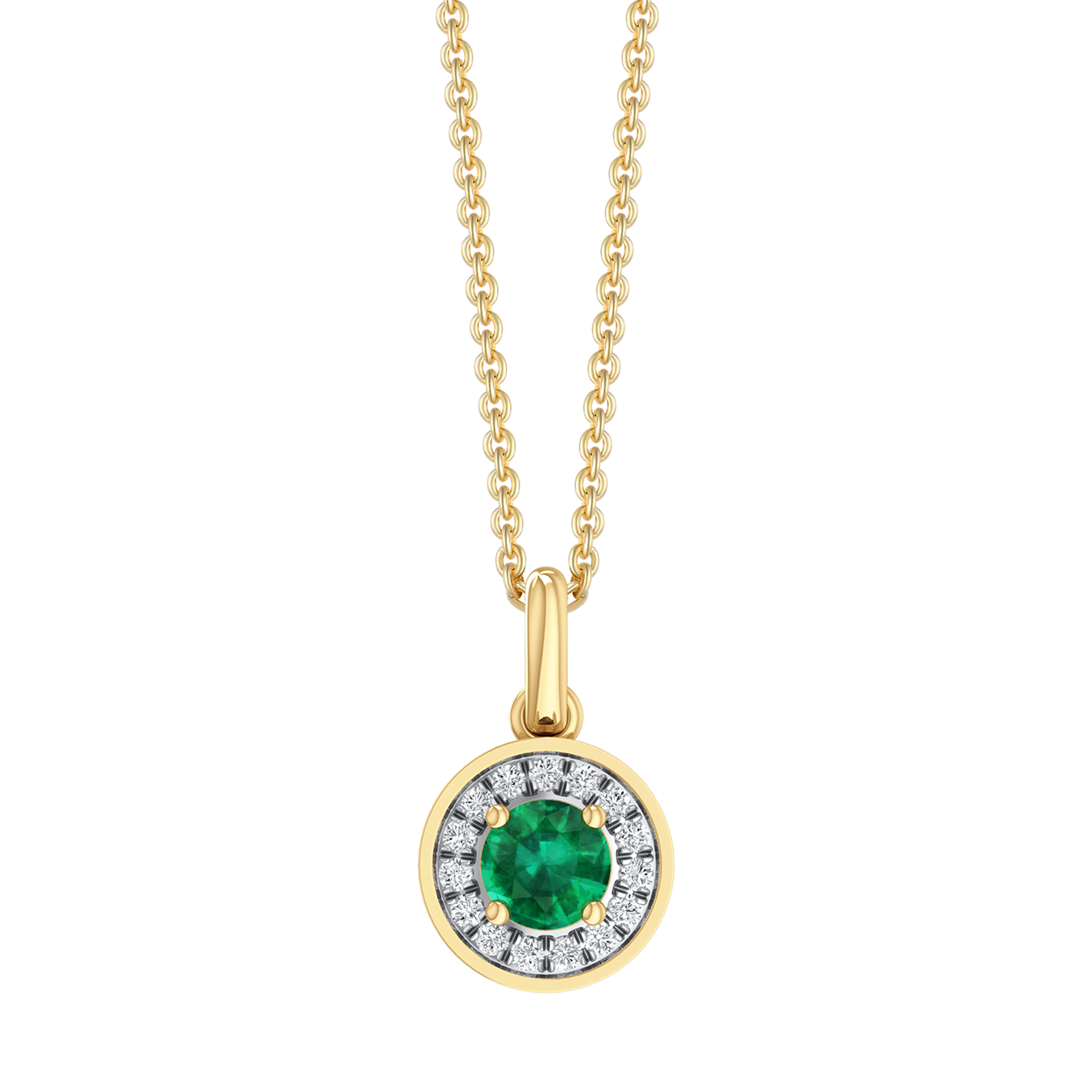 14 kt. guld vedhæng cirkel med smaragd og brillanter omkring.