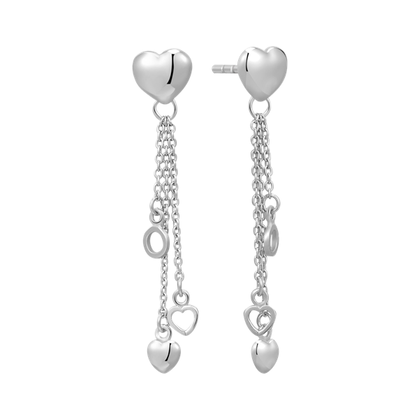 Sølv ørehænger rhodineret hjerte med 3 kæder som hænger med hjerte,cirkel og lukket hjerte.