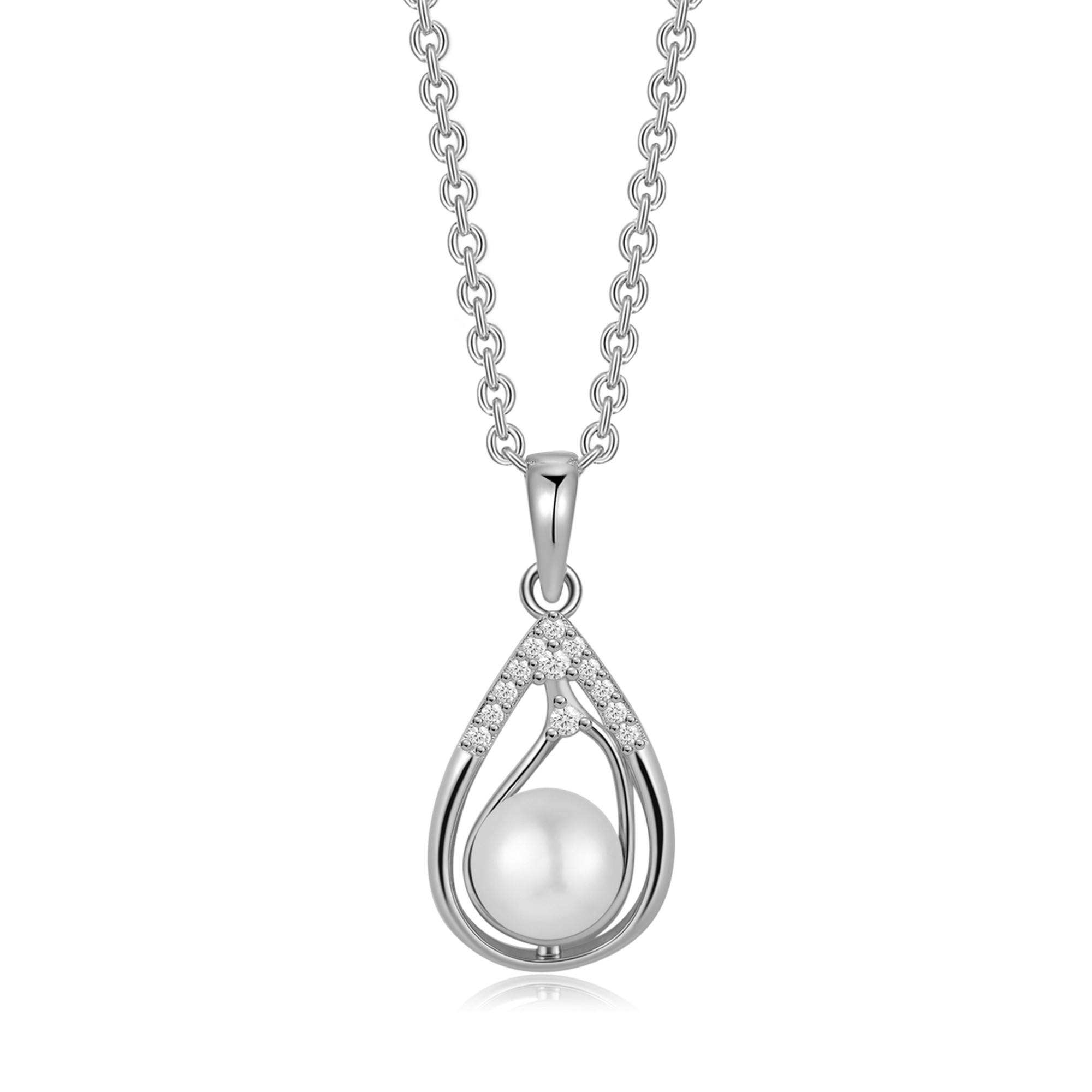 Sølv halskæde rhodineret dobbelt dråbe med syntetiske cubic zirconia og ferskvandsperle.