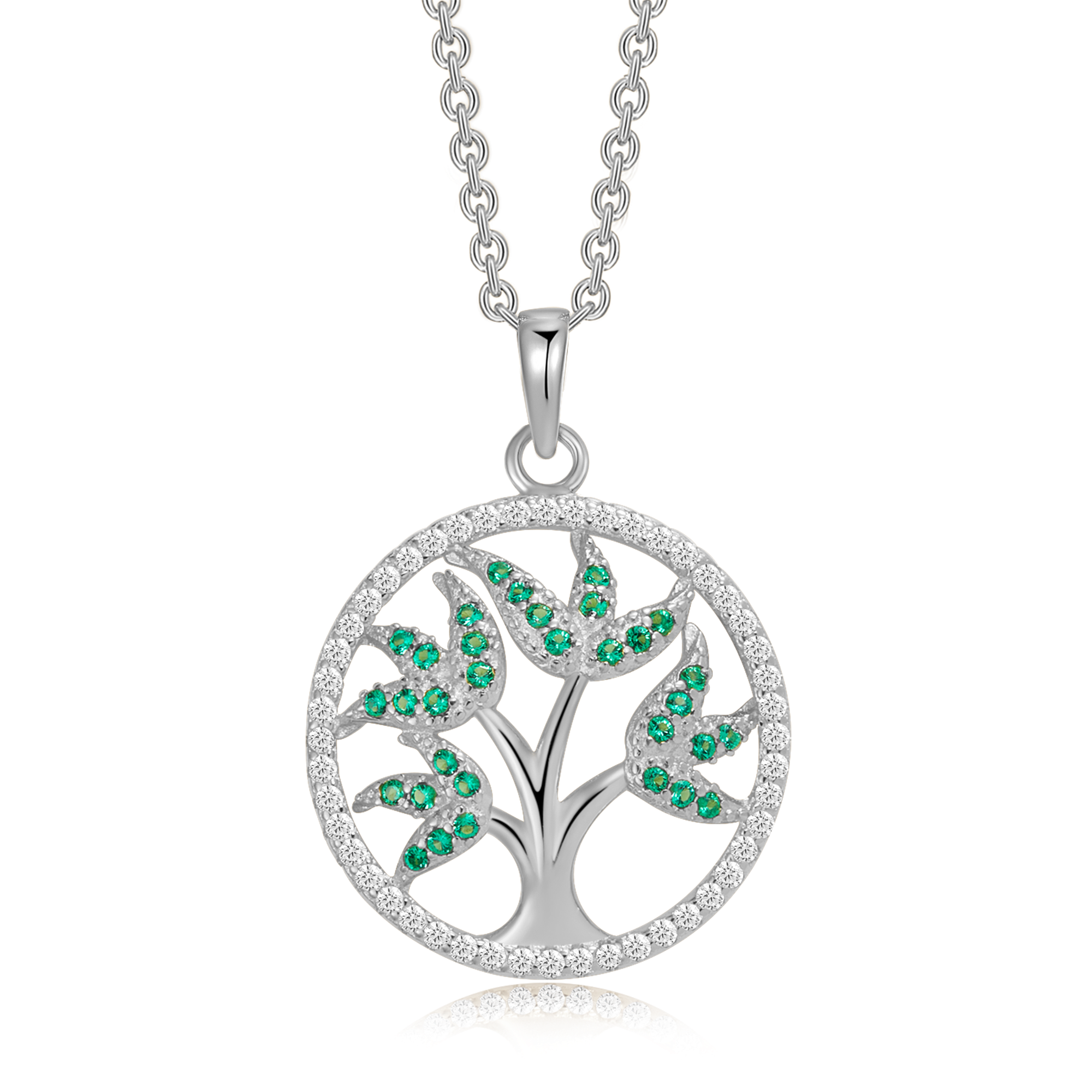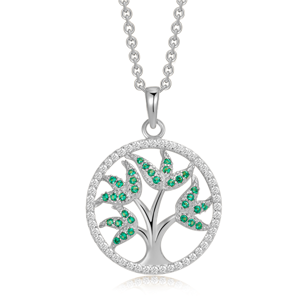 Sølv halskæde rhodineret livets træ med 4 grene og grøn syntetiske cubic zirconia som blade.
