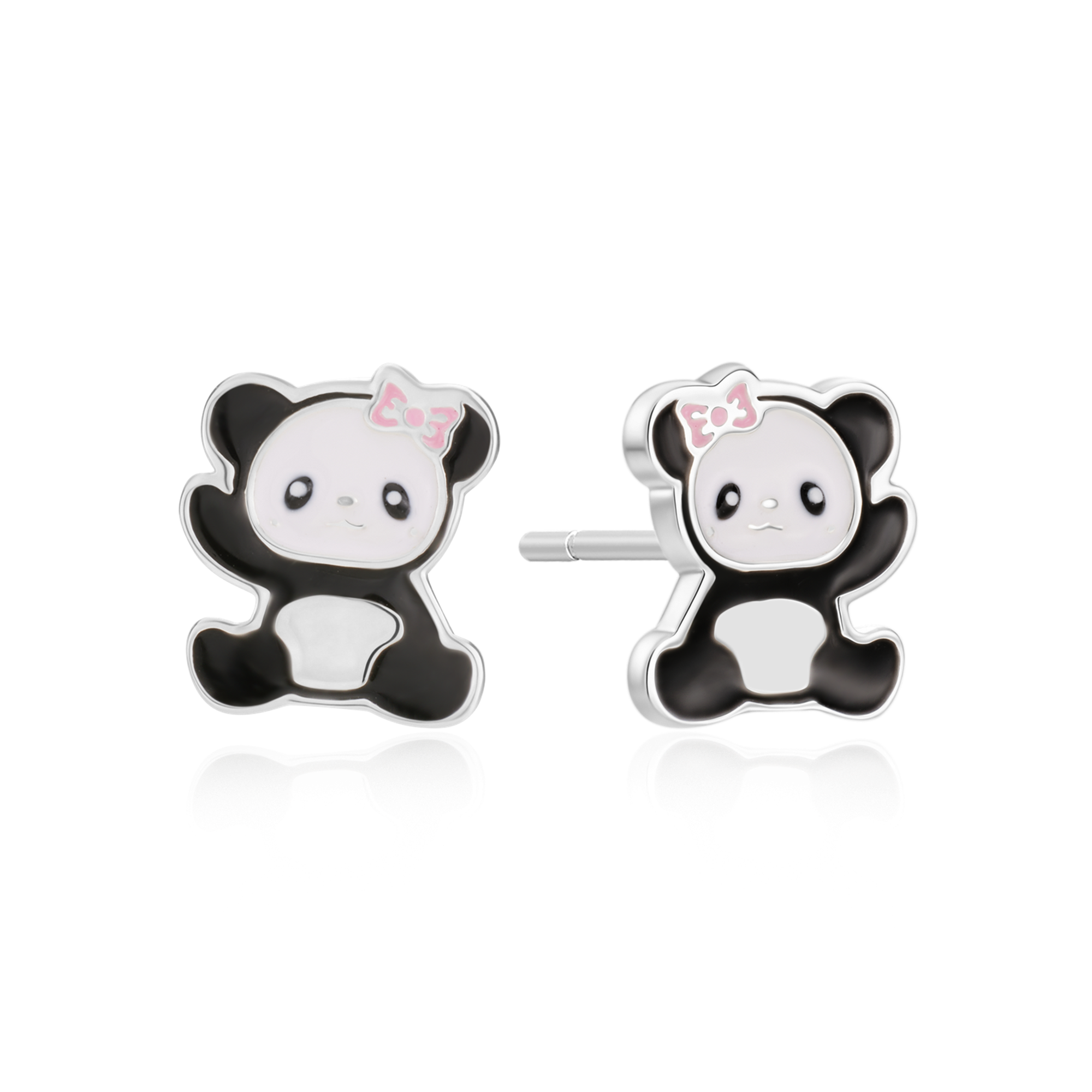 Sølv ørestikker panda med hvid hoved og sort krop med pink sløjfe blyfri emalje.