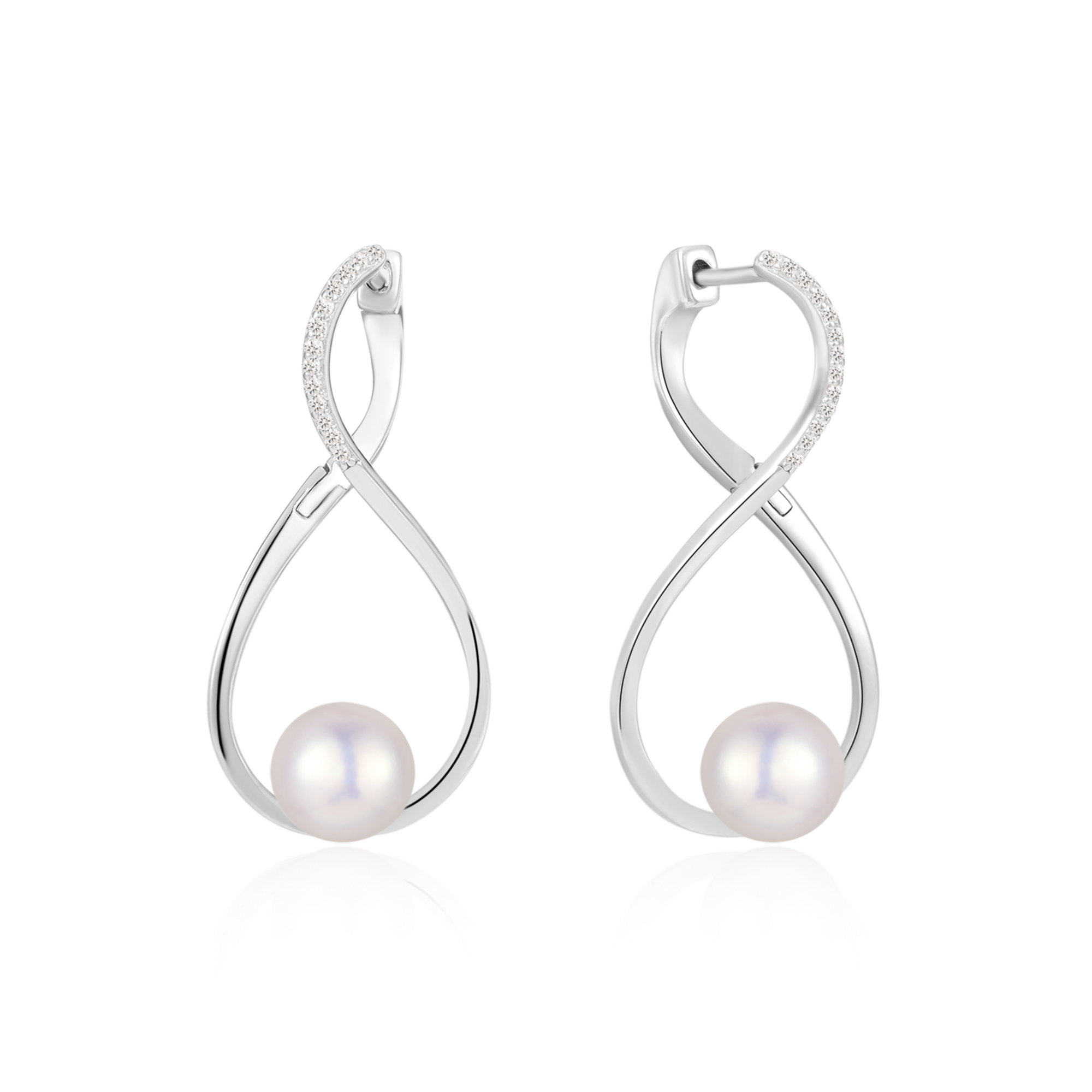Sølv ørestikker rhodineret evighedstegn med ferskvandsperle og syntetiske cubic zirconia.