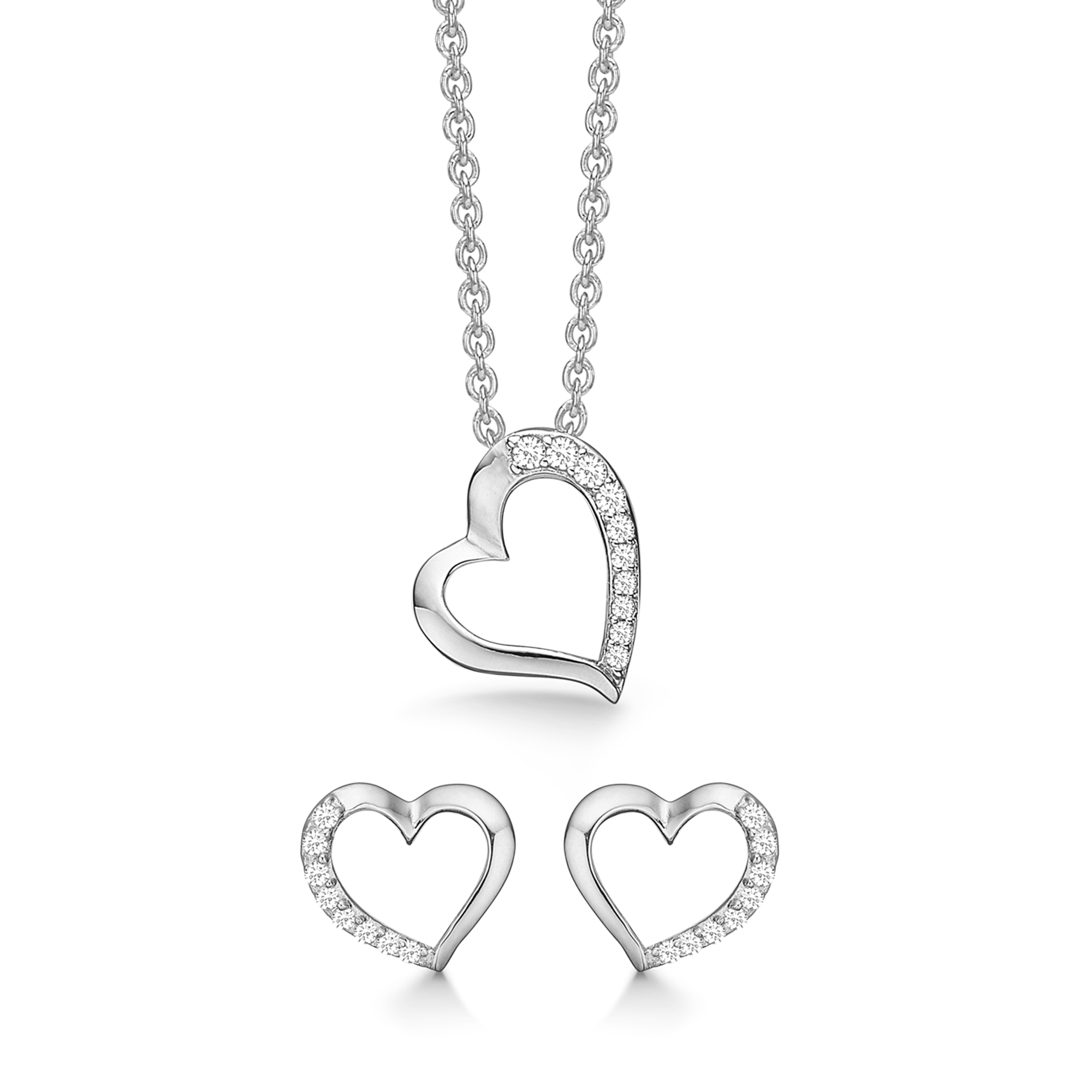 Sølv smykkesæt rhodineret skæv hjerte med syntetisk cubic zirconia