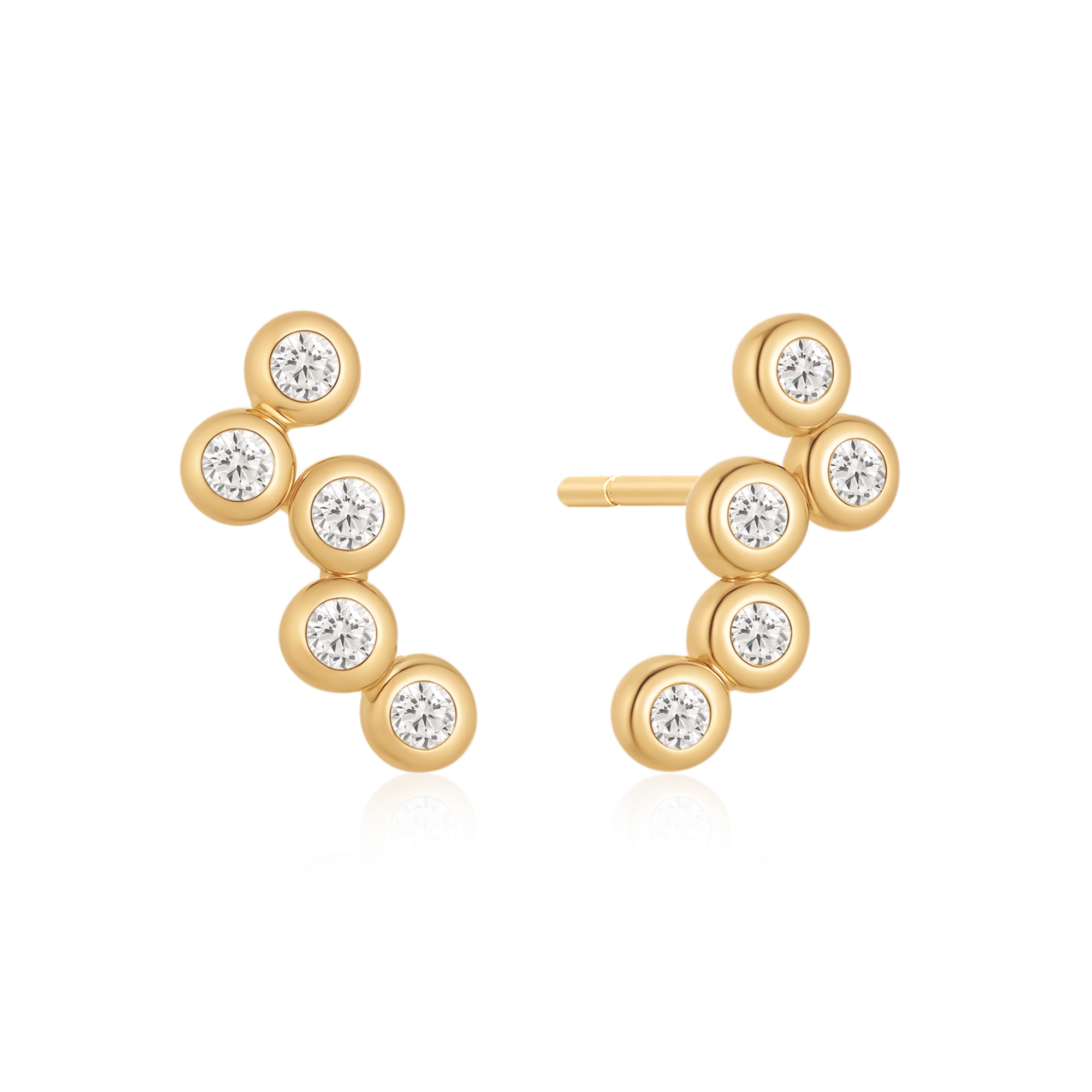 Disse sølvforgyldte ørestikker fra Støvring Design forener luksuriøst design med holdbarhed. Det bueformede design med fem strålende cubic zirconia sten skaber et sofistikeret udtryk, der indrammer ansigtet smukt. Ørestikkernes gyldne finish giver et luksuriøst udtryk, der komplementerer festlige outfits ideelt.