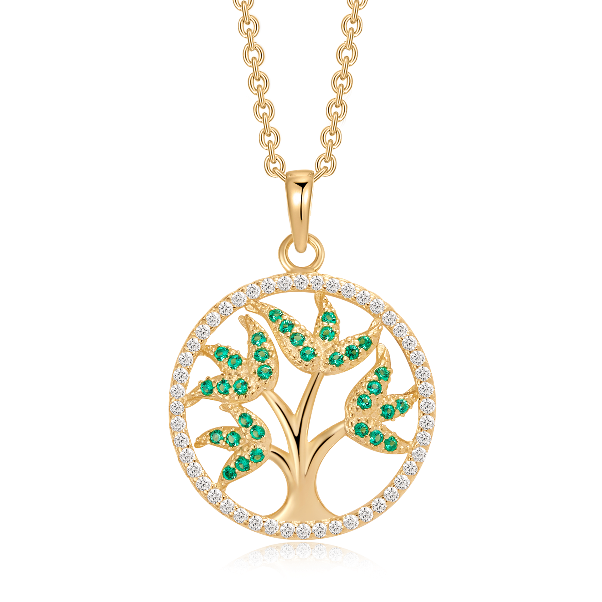 Sølvforgyldt halskæde livets træ med 4 grene og grøn syntetiske cubic zirconia som blade.