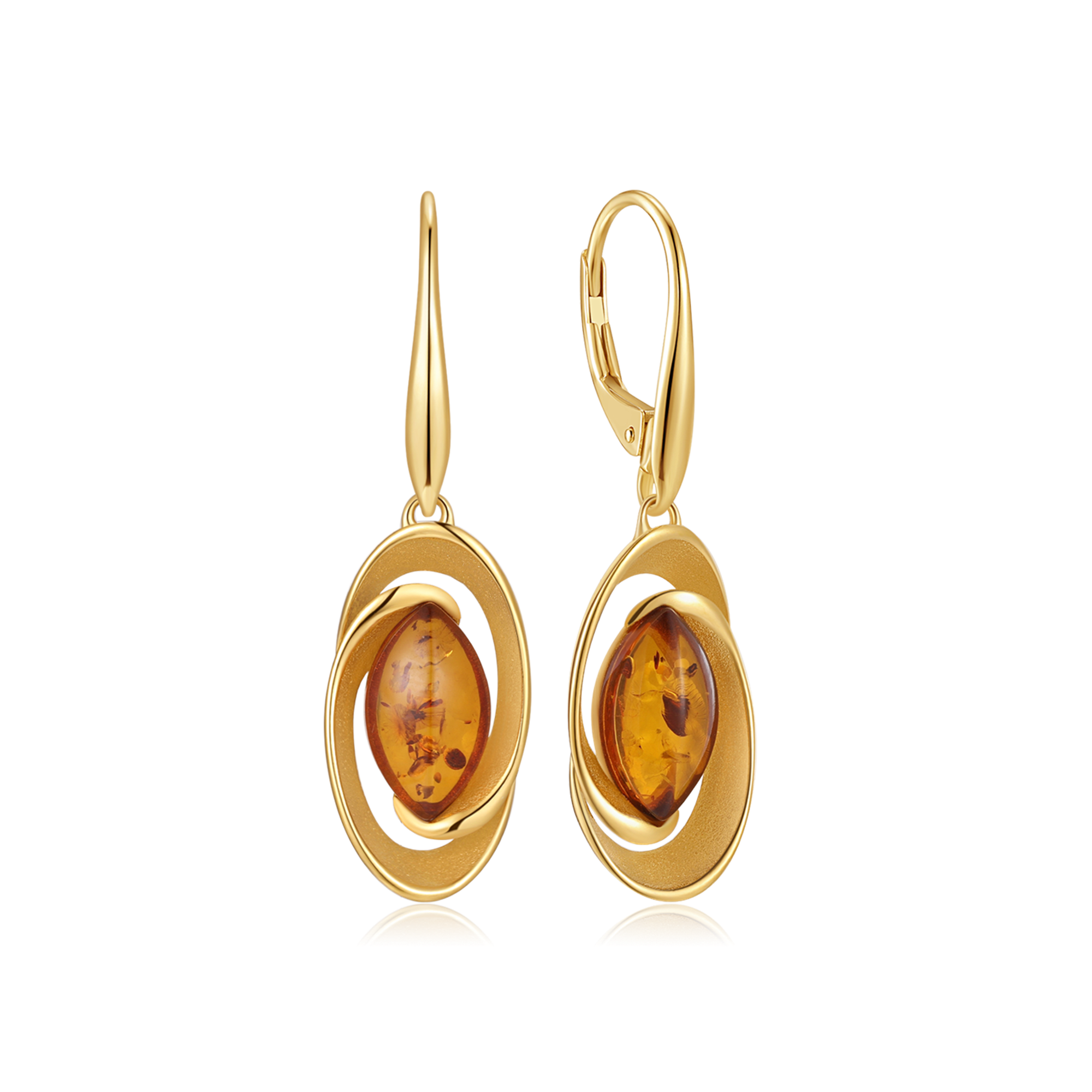 Sølvforgyldt ørehængere flettet oval med rav i midten., fra Støvring Design