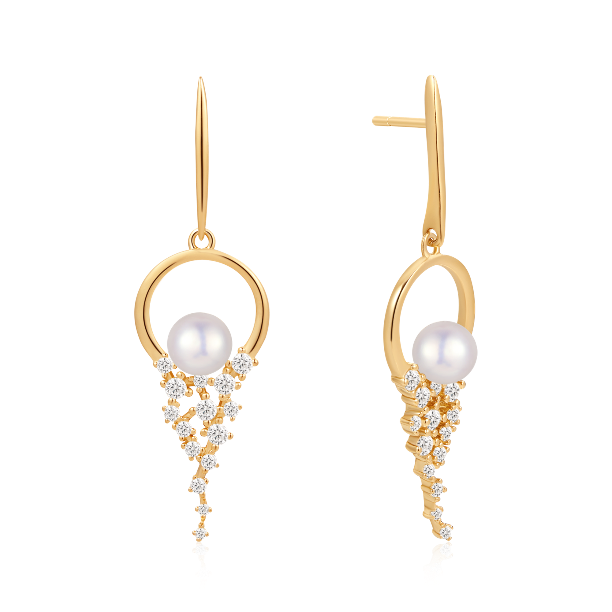 Sølvforgyldt ørehænger pind med cirkel i bunden dråber med syntetiske cubic zirconia og ferskvandsperle i midten.